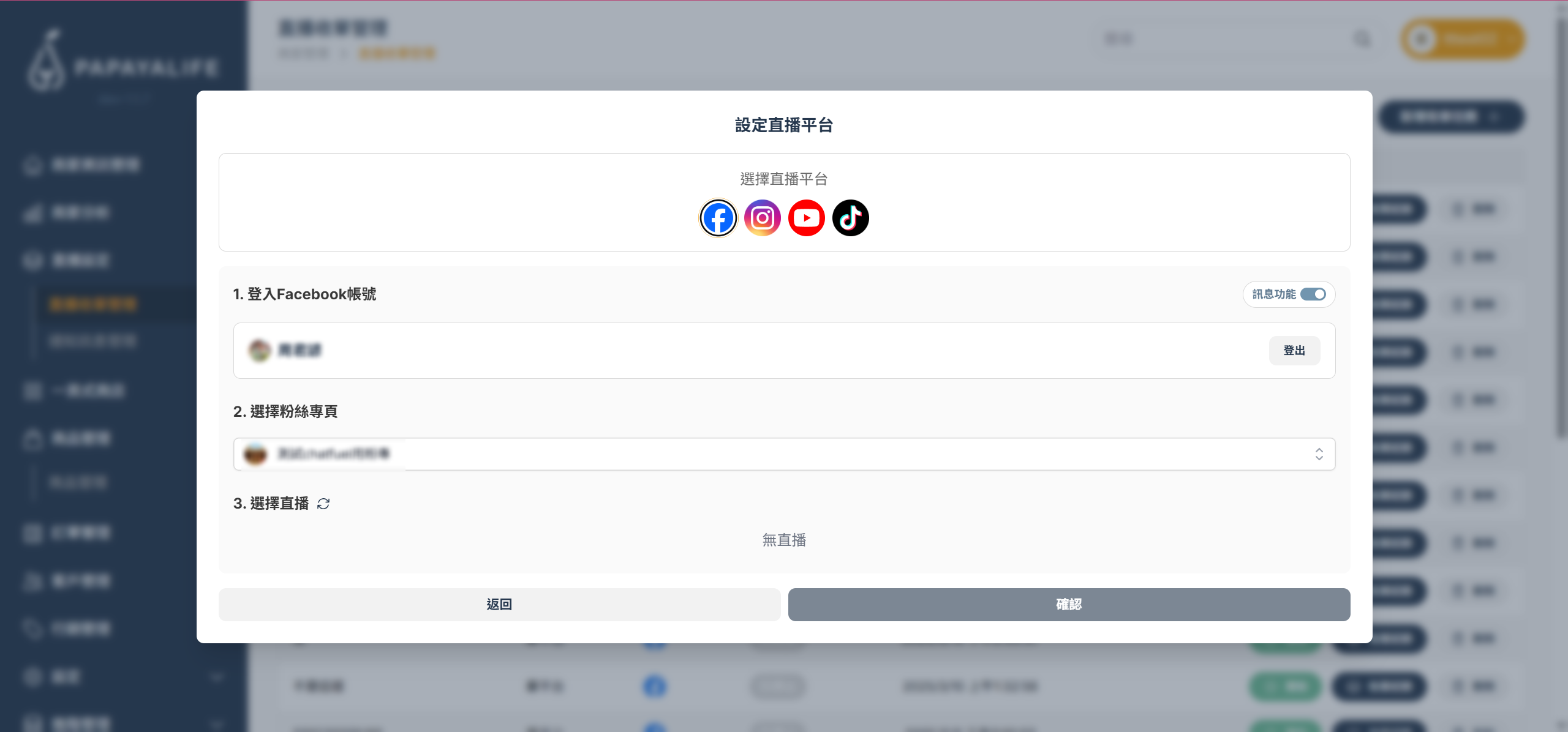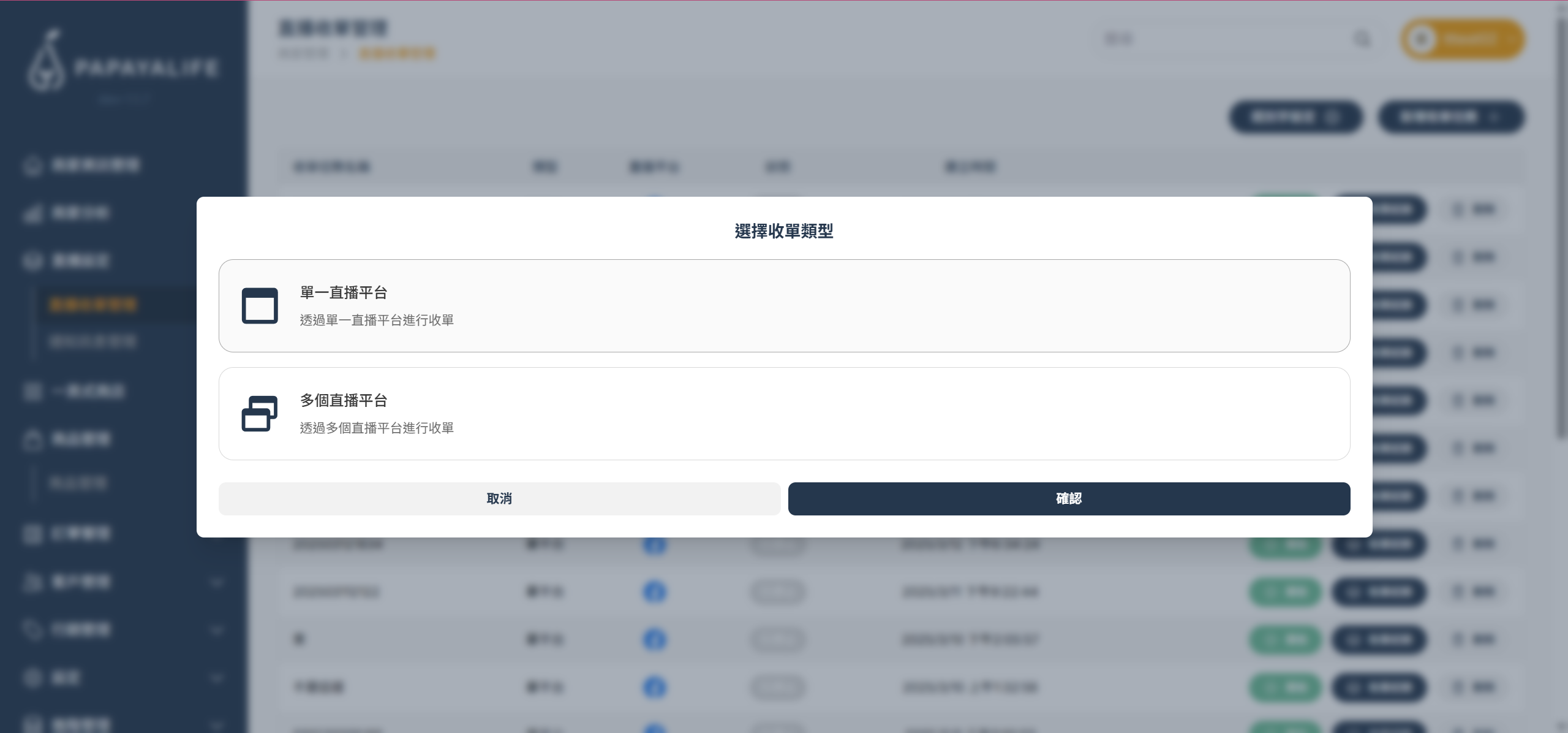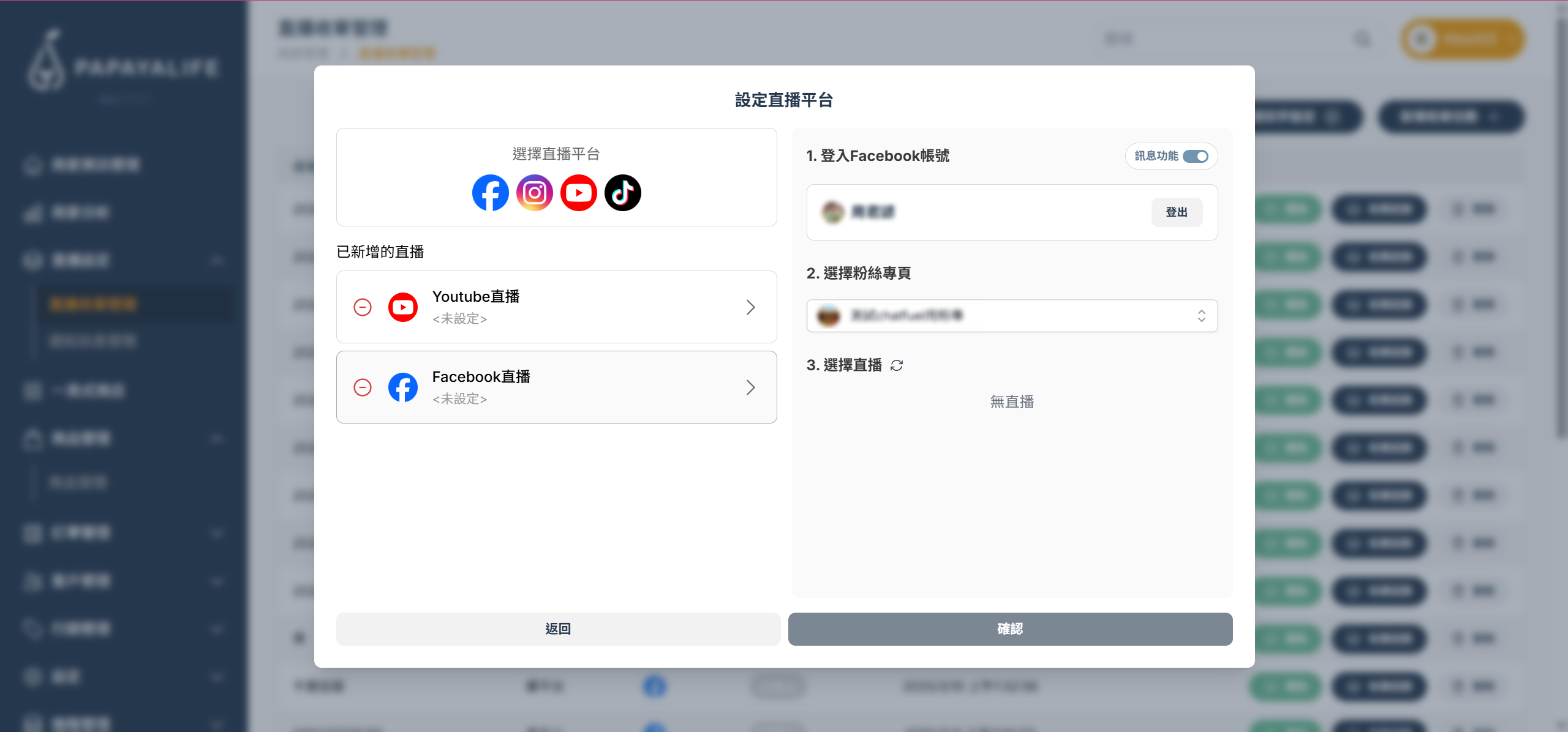 直播相關功能¶ 連結 Facebook、Instagram、YouTube 直播,自動化觀眾留言下單 連結 Facebook 直播 Facebook 通知訊息管理 連結 Instagram 直播 連結 Youtube 直播 直播收單任務功能簡介 建立收單任務時,可選擇兩種模式¶ 單一平台模式: 一次任務只針對一個直播來源(如一個FB粉絲頁或一個YouTube頻道)。 多個平台模式: 一次任務可同時聚合來自多個來源的留言進行收單(例如:1個FB + 1個YT + 1個IG,或 2個FB + 1個IG 等組合)。 點擊側邊欄,直播設定⇒「直播收單管理」,至直播收單管理頁面,點選"新增收單任務",可選擇兩種模式。 多個平台模式,可同時選擇多個來源的留言進行收單 單一平台模式,只針對一個來源留言進行收單