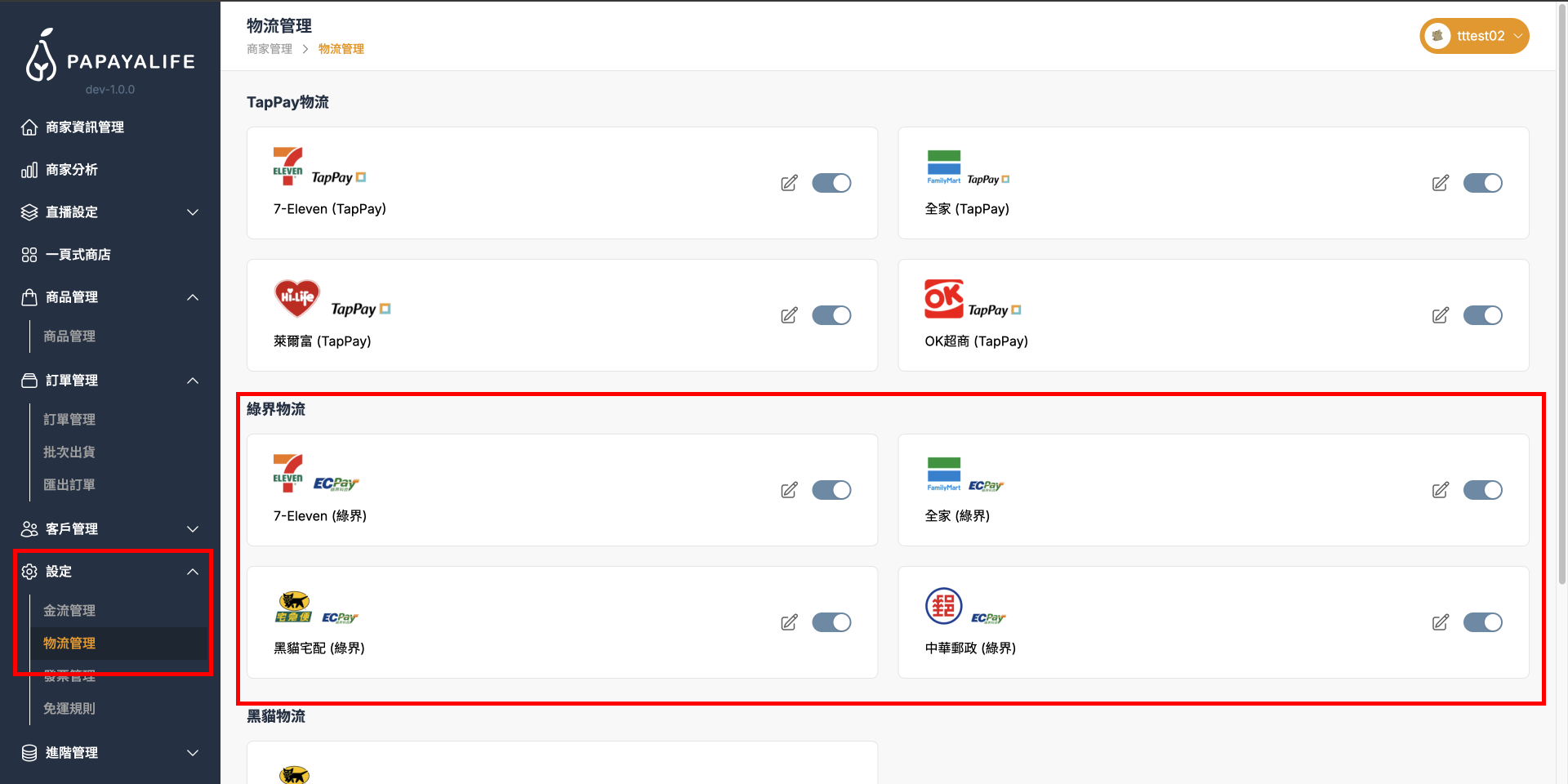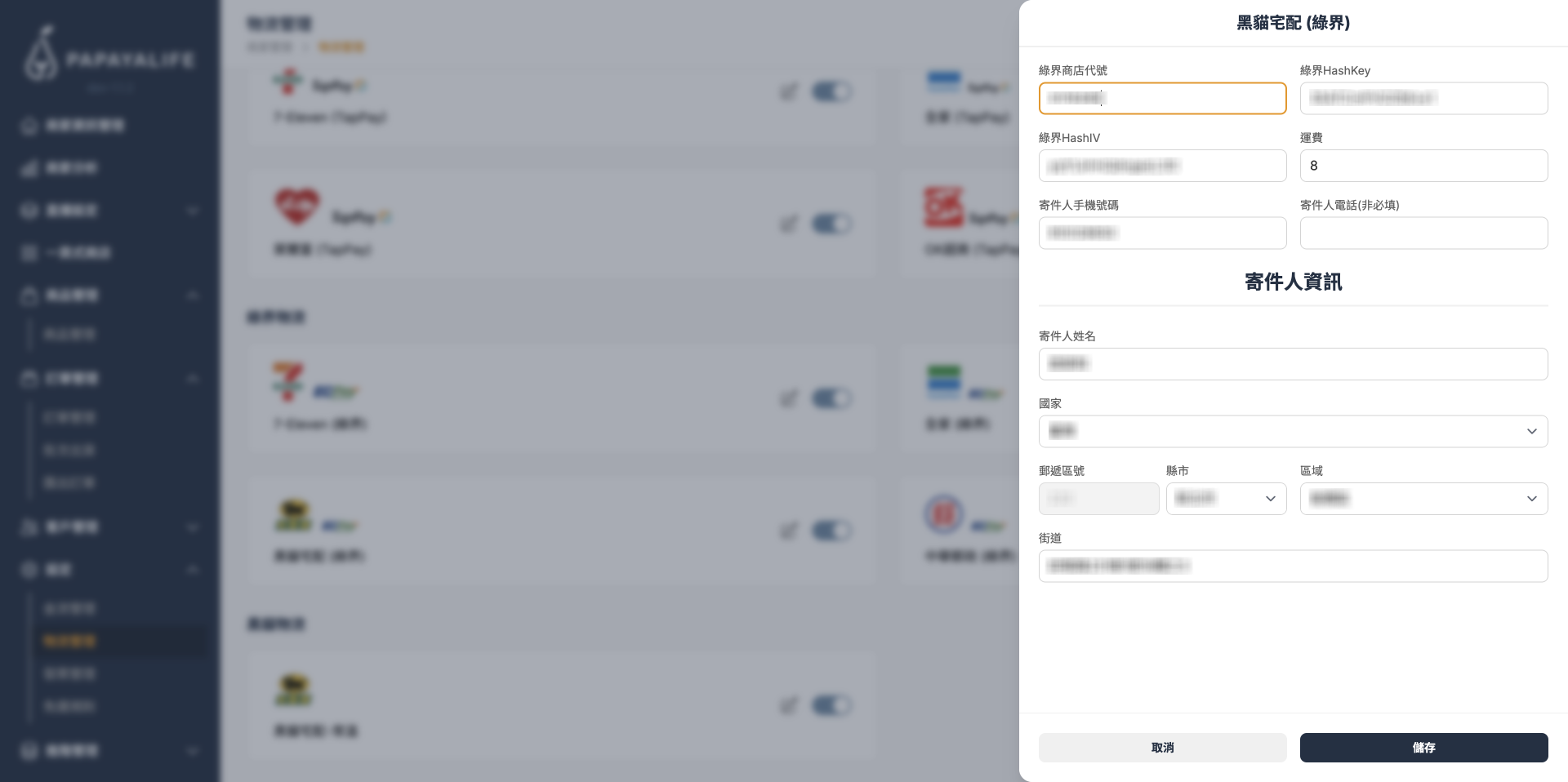 綠界黑貓宅急便¶ Abstract 需先前往「綠界ECPay」官網進行「會員註冊」,註冊完成後,與綠界申請物流寄送服務,「綠界ECPay」即會在店家的「綠界廠商管理後台」提供店家「商店代號」、「HashKey」、「HashIV」等三組資料做串接 註冊成為綠界會員 前往木瓜生活後台,至物流管理頁面,綠界物流區塊進行編輯 點擊黑貓宅配(綠界)區塊編輯 icon 於編輯視窗進行編輯 編輯完成後,點擊「儲存」