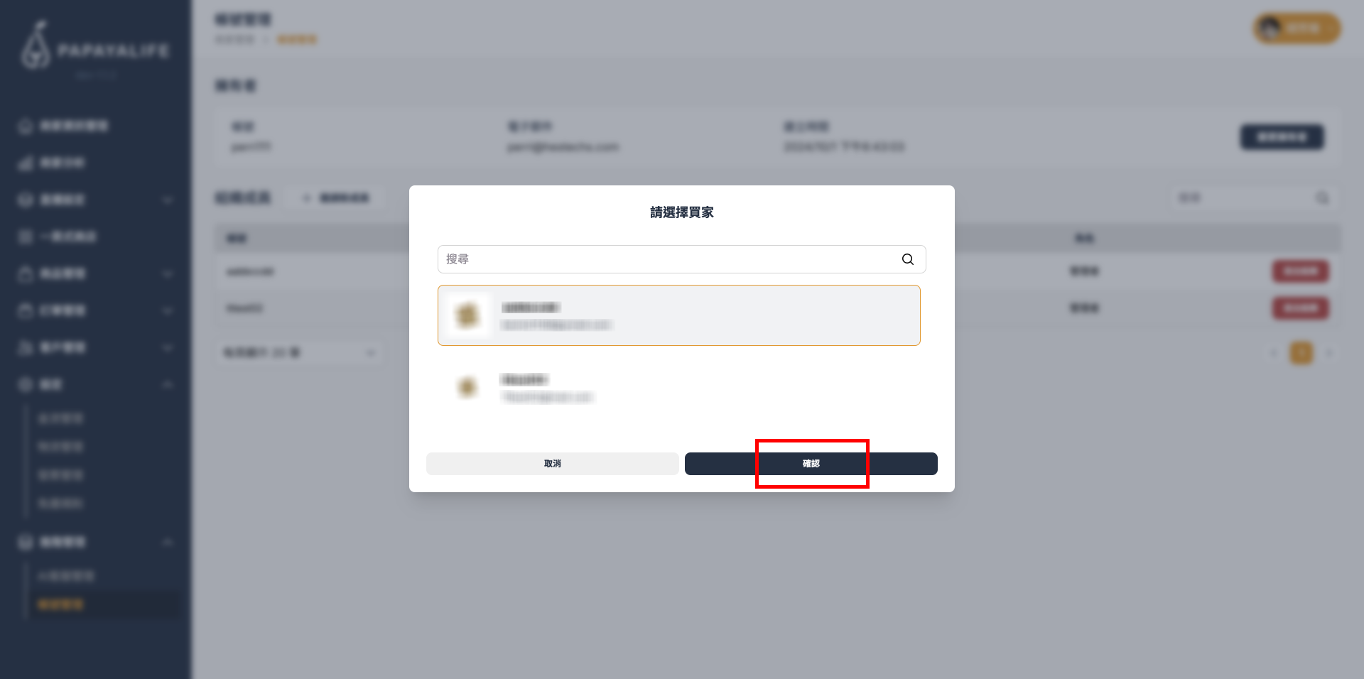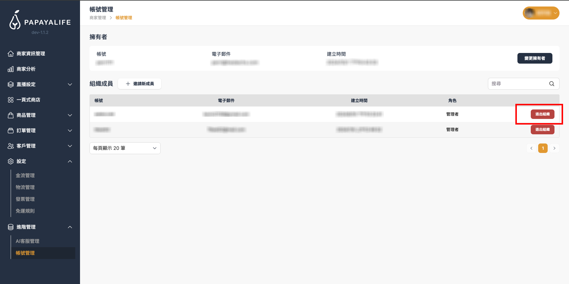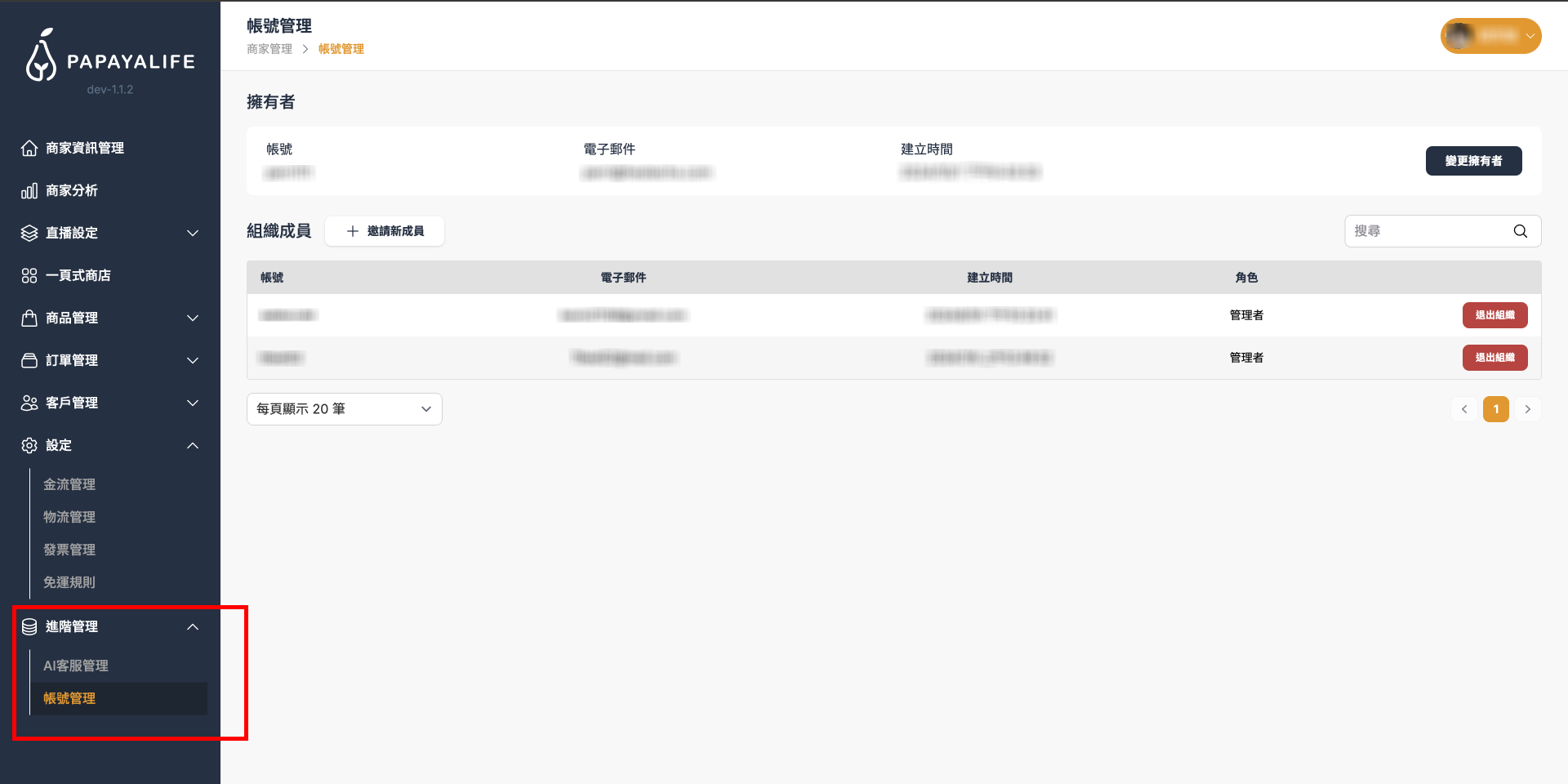 賣家成員管理¶ 查看、管理該商家所有管理者 點擊側邊欄中,進階管理⇒「帳號管理」,至帳號管理頁面 「擁有者」可進行「變更擁有者」、「邀請新成員」、「退出組織」的操作 變更擁有者¶ 點擊「變更擁有者」,點擊後跳出「選擇買家」視窗,可選擇組織成員為新的擁有者 選擇後點擊「確認」 邀請新成員¶ 點擊「邀請新成員」後,跳出邀請新成員視窗,輸入被邀請人的 Email,點擊「確認」 該邀請人會收到 Email 邀請信,確認後即成為該組織成員 退出組織¶ 點擊成員欄位右邊的「退出組織」按鈕,退出後該成員帳號將無法存取組織後台