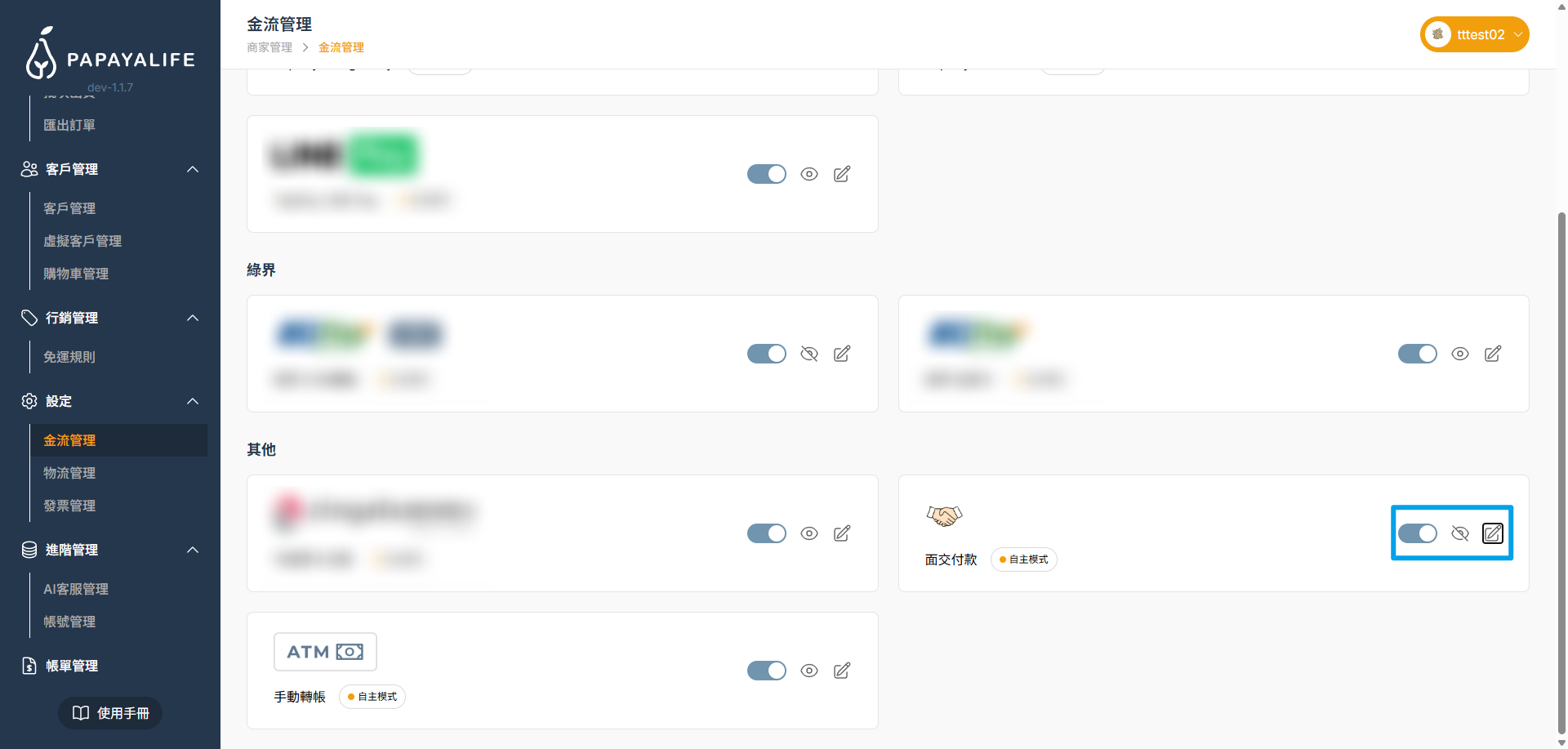 面交付款¶ 於面交付款 區塊可編輯是否啟用 運作方式: 提供給客戶線下面對面付款的選項。 設定: 啟用即可,無特殊參數。 物流綁定: 此付款方式會 強制綁定 物流方式為「買家自取」。 適用場景: 適用於客戶會親自到場取貨並付款的情境(例如大型家具)。